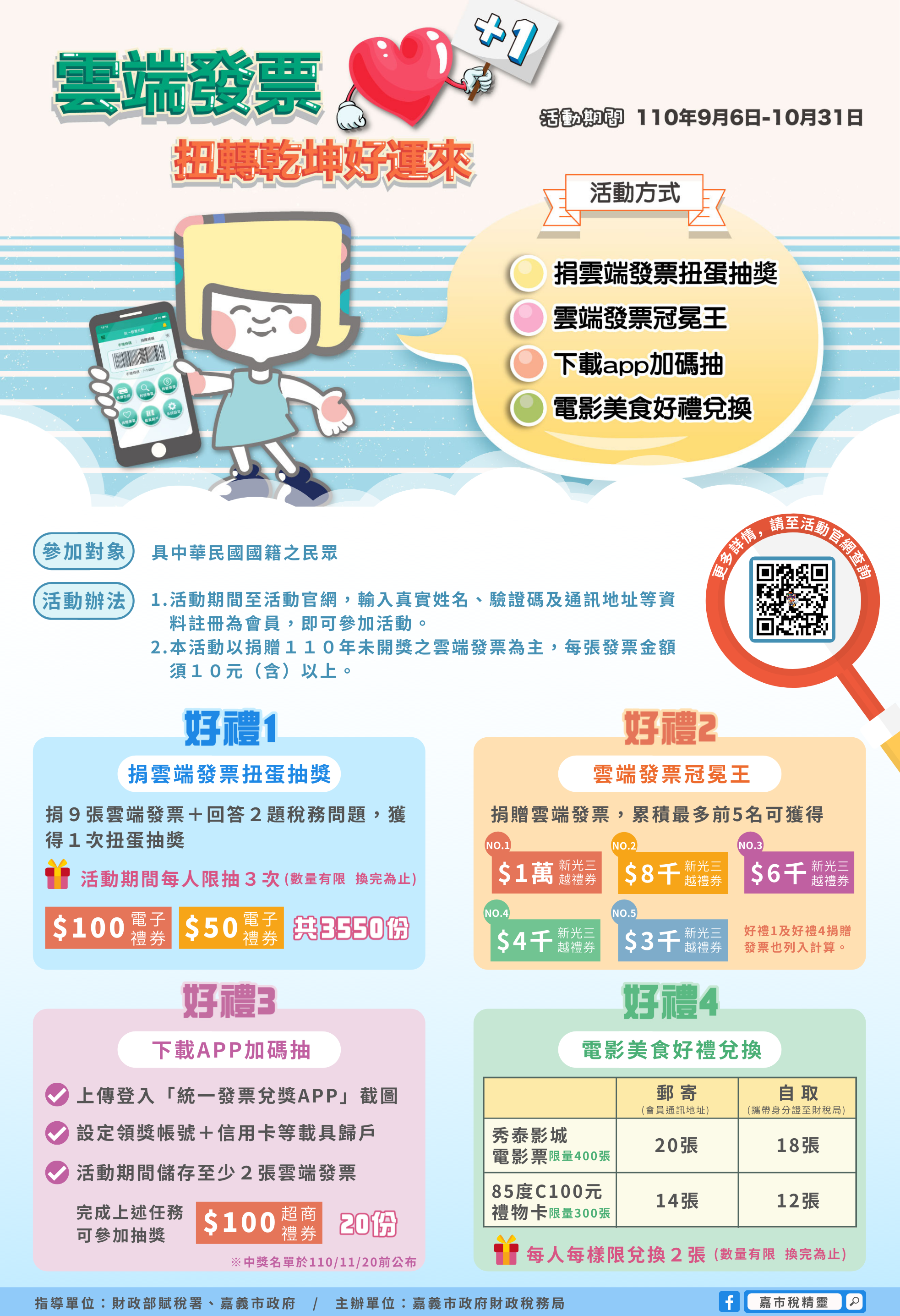 (一)捐雲端發票扭蛋抽奬-於活動網站捐出110年尚未開奬之雲端發票9張(每張金額10元以上),並回答2題稅務問題,可取得1次扭蛋機會,活動期間每人限抽3次,奬項為超商電子禮券50元或100元,共計3,550份。