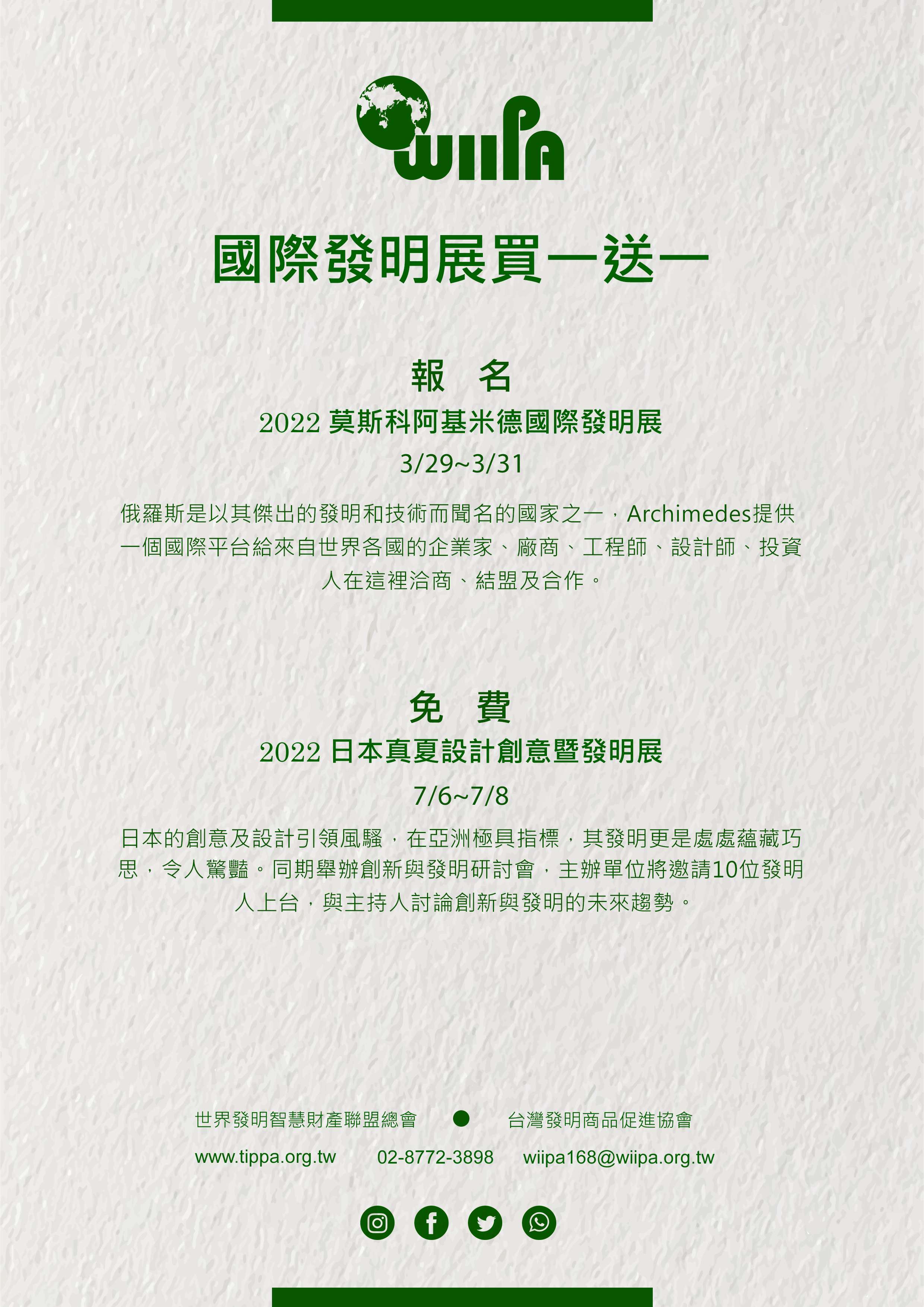 台灣發明商品促進協會舉辦「2022莫斯科阿基米德國際發明展」買一送一補助專案,請有興趣師生參加比賽。
