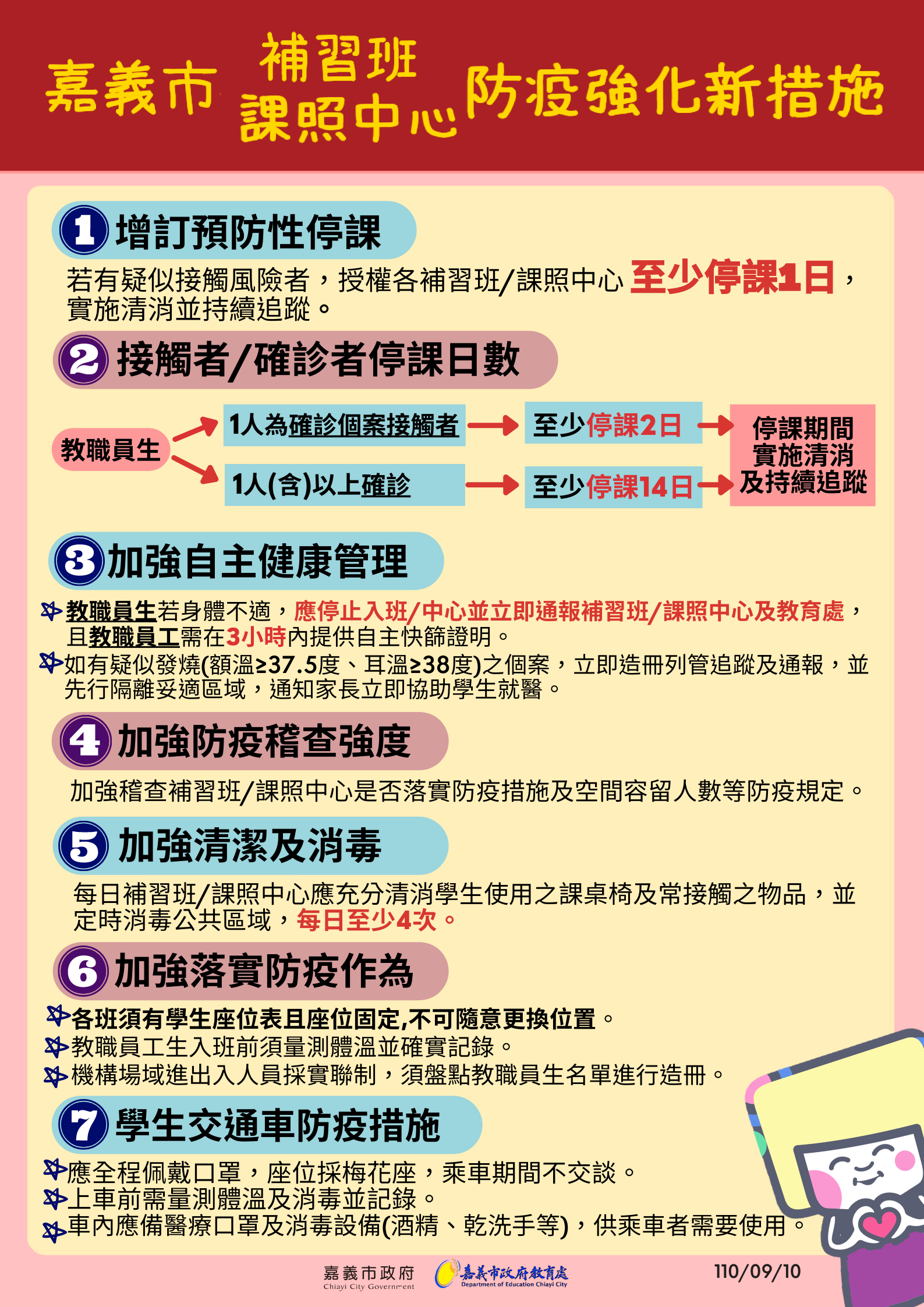 二、為關懷學童安全及健康,請各校務必確實掌握學生課後學習情形及相關防疫作為,並請利用班/集會或張貼聯絡簿等方式向家長及學生宣導補習班及課照中心相關防疫資訊及措施,本府亦將不定期派員前往短期補習班及兒童課後照