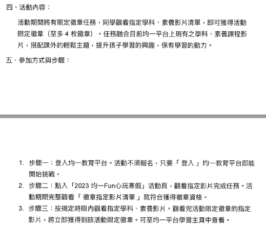 (四)活動方式:學生於前述指定時間,註冊或登入均一教育