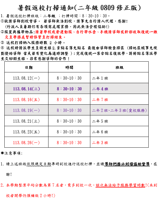 三、手機請導師或幹部收取後統一繳交至學務處暫時保管至打掃結束。(未繳交而過程違規仍依照手機管理辦法處置!)