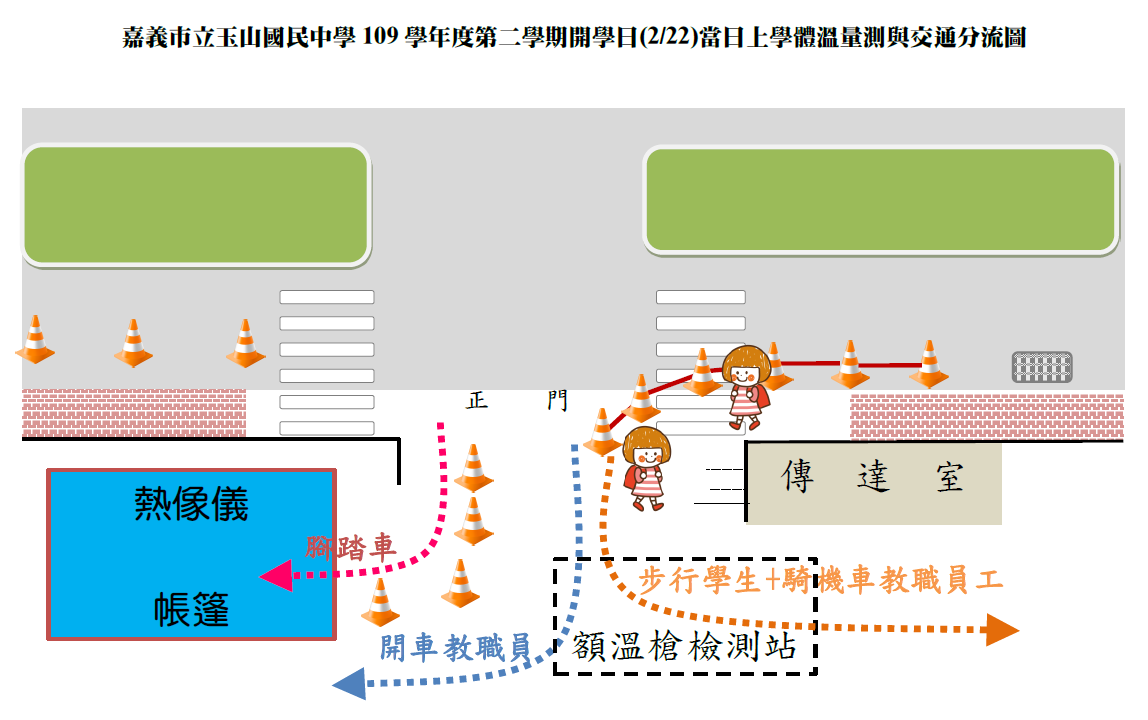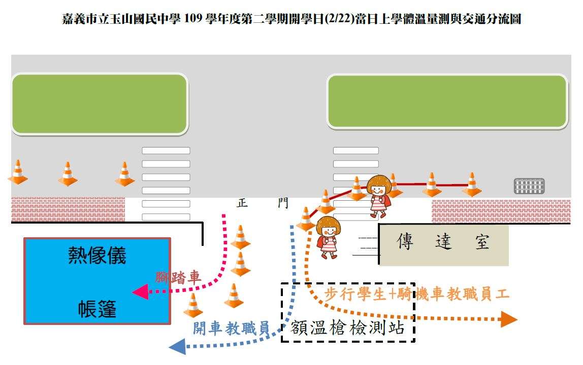 上藍色玉山國中手章後下地下室。若人數較多或熱像儀判讀有狀況,輔以額溫槍、