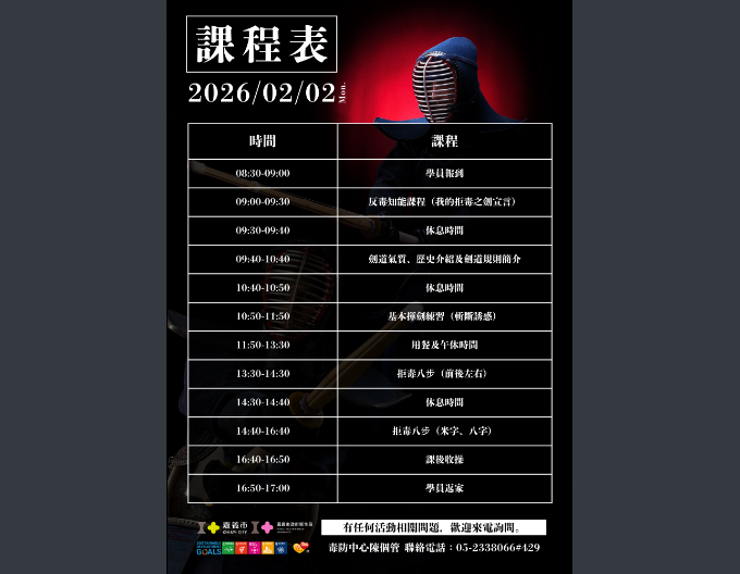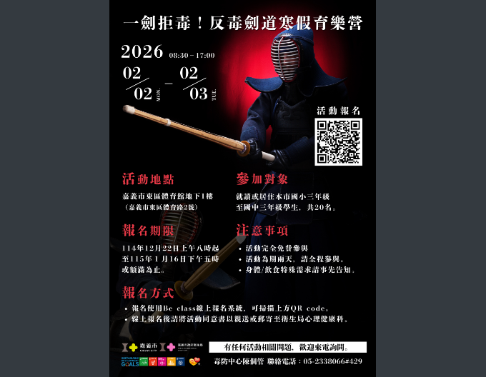 衛生局為提升兒少健康休閒意識並加強反毒教育,於115年2 月2日至115年2月3日特辦理「一劍拒毒!反毒劍道寒假育 樂營」,請踴躍報名參加
