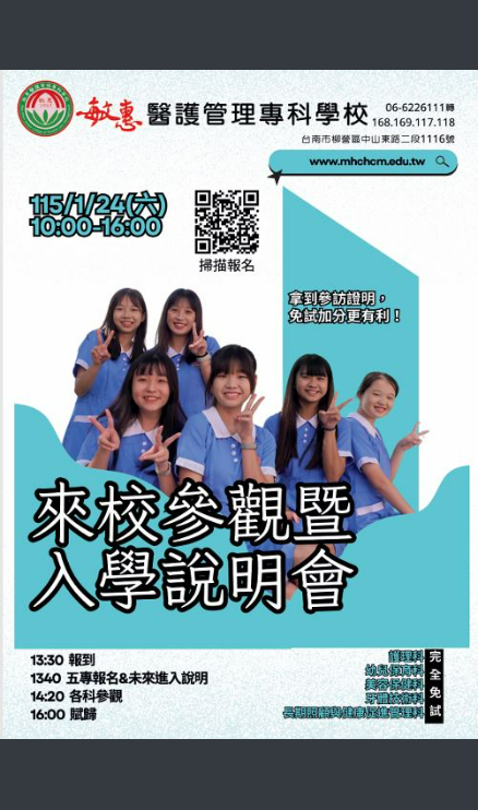 轉知敏惠醫護管理專科學校舉辦五專入學校園說明會,歡迎有興趣的同學自行報名參加。
